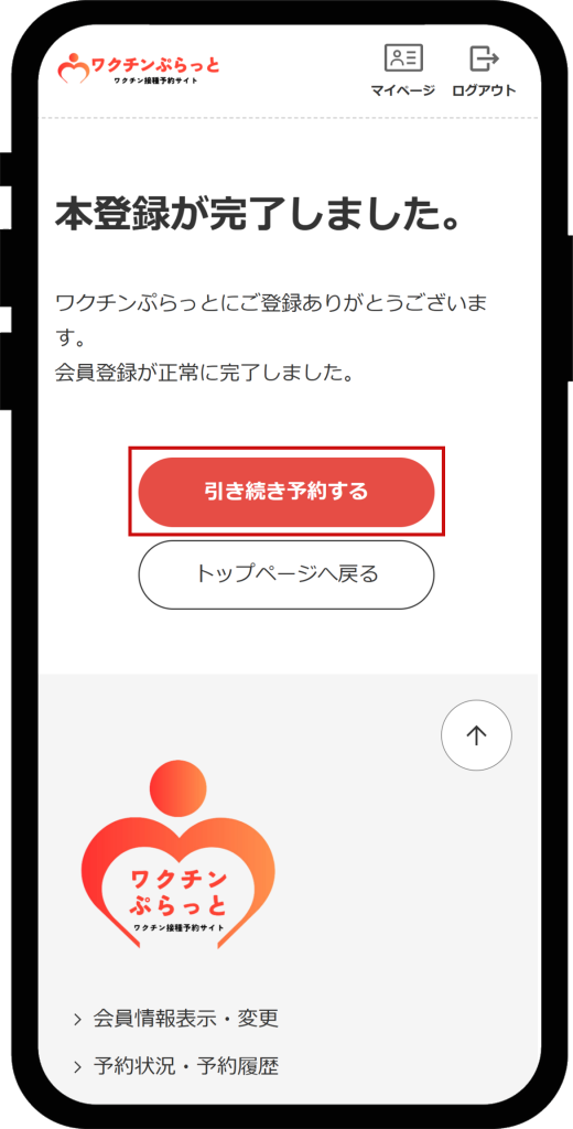 会員登録後に出てくる「引き続き予約する」をタップ又はクリックして、予約してください。