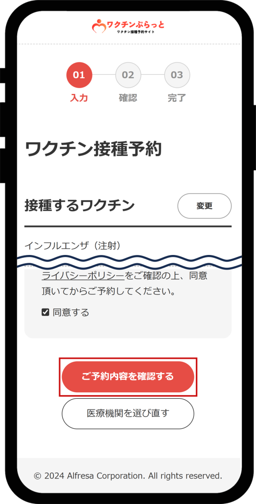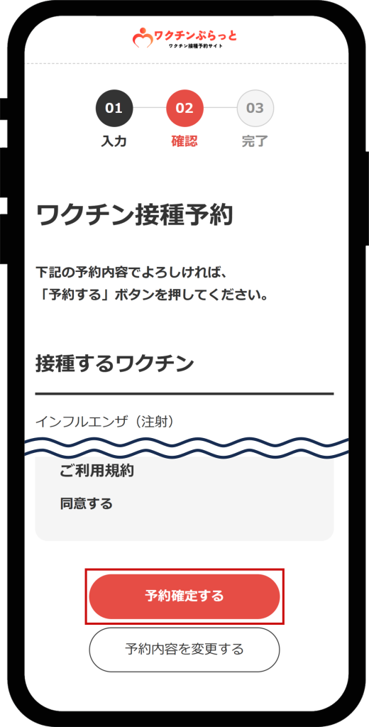 ② 「ワクチン接種予約」画面で必須項目を入力後、「ご予約内容を確認する」をタップ又はクリックして、予約内容を確認してください。